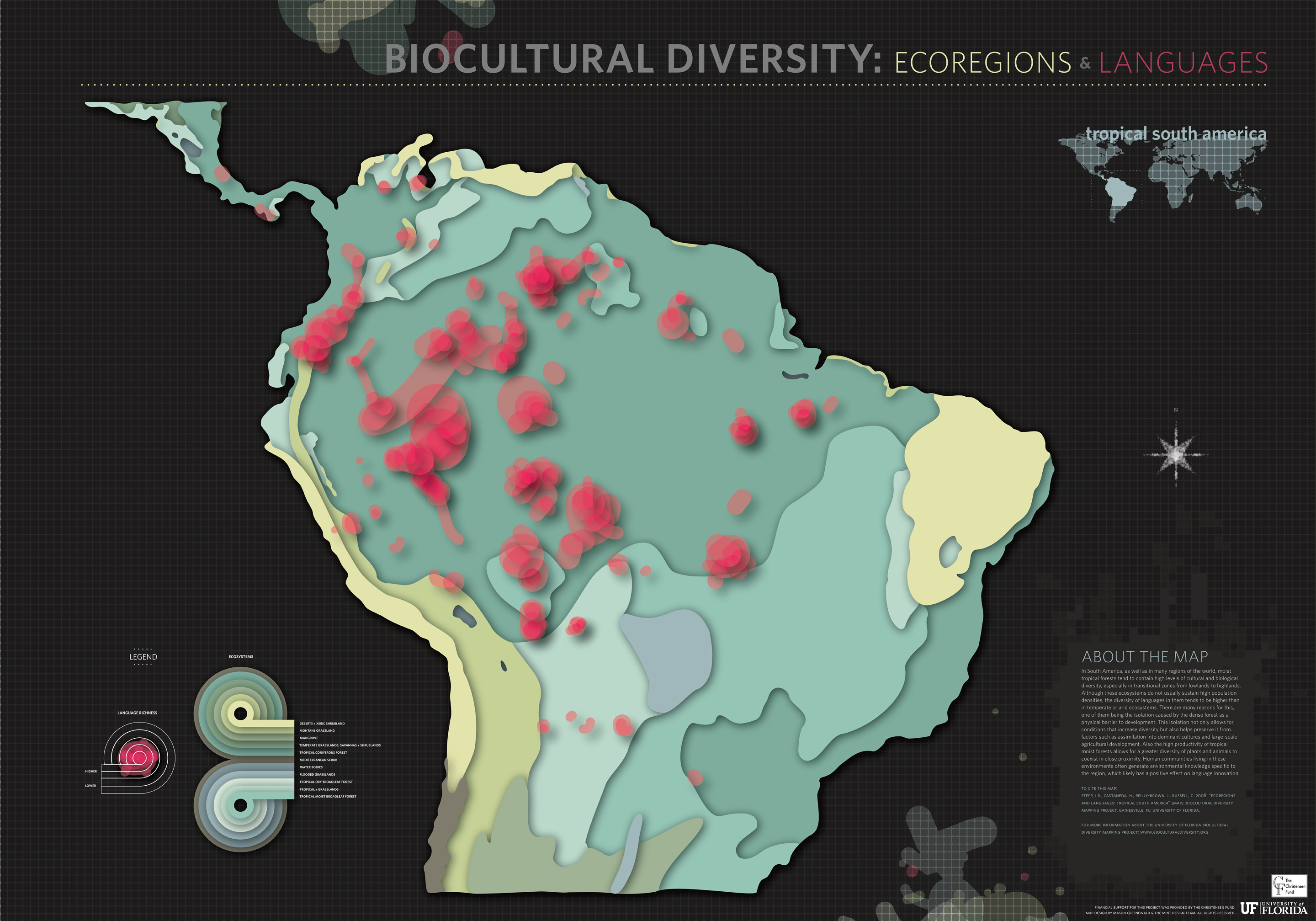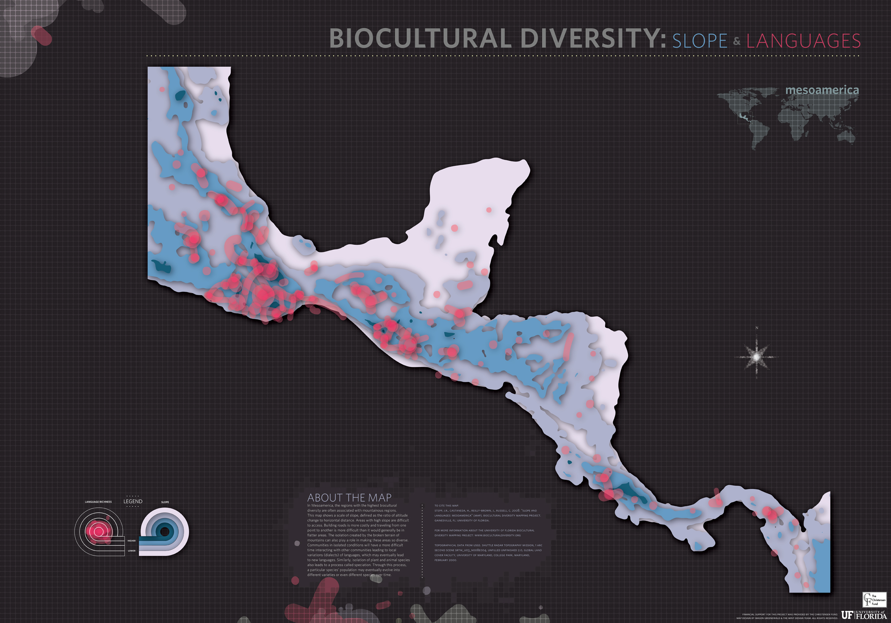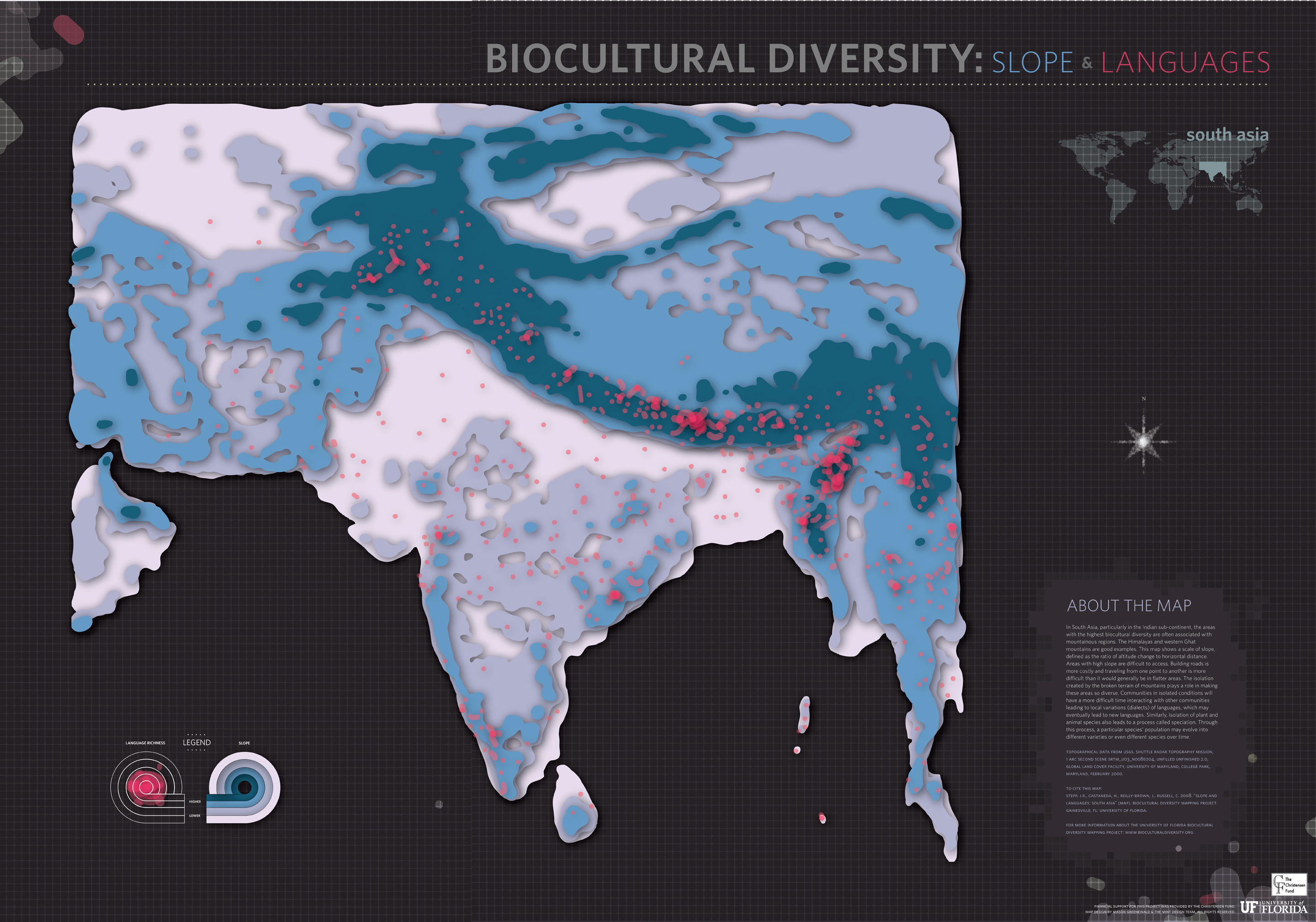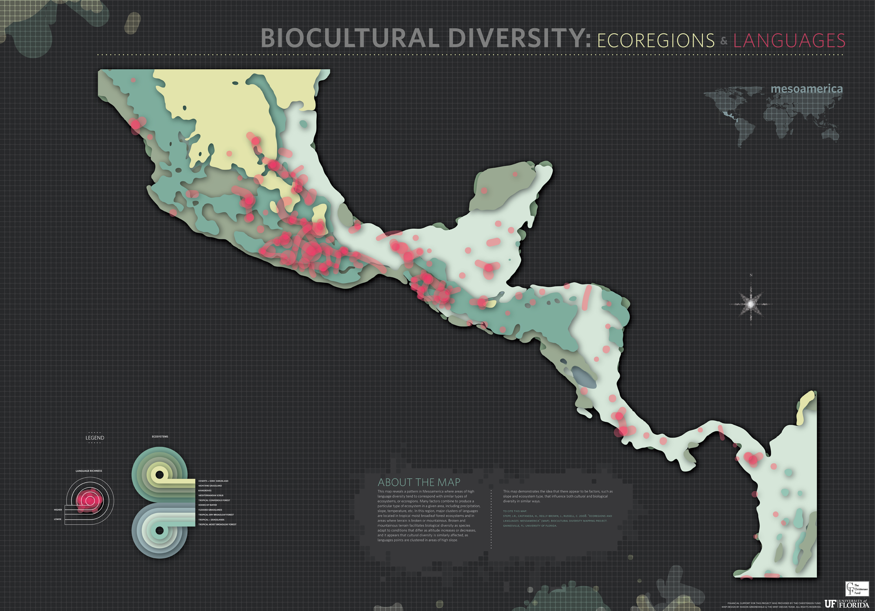 These maps represent some of the results from the University of Florida’s Biocultural Diversity Mapping Project. They feature some of the regions with high biocultural diversity, including Mesoamerica, the Amazon-Andean slope, the greater Himalayas, equatorial Africa, greater Southeast Asia/Melanesia.