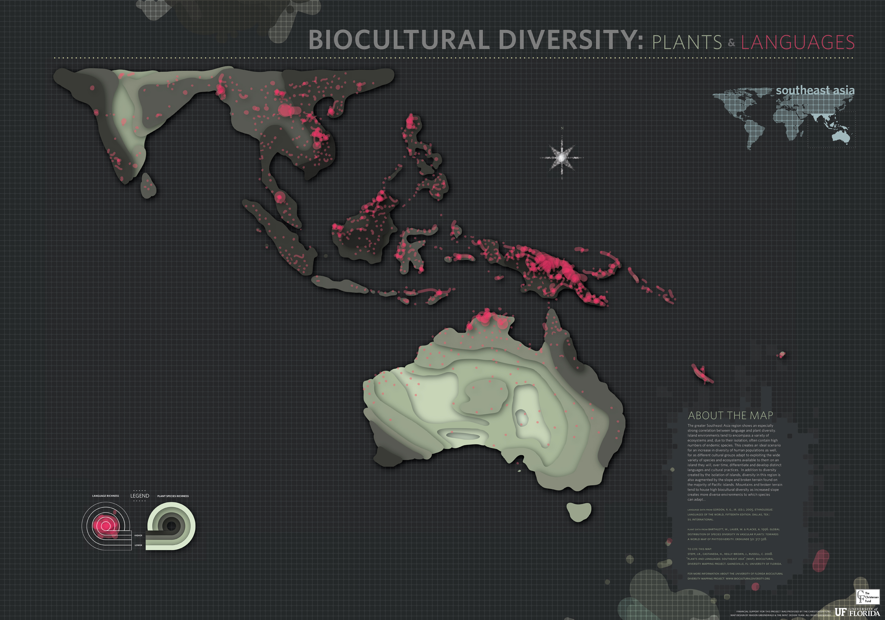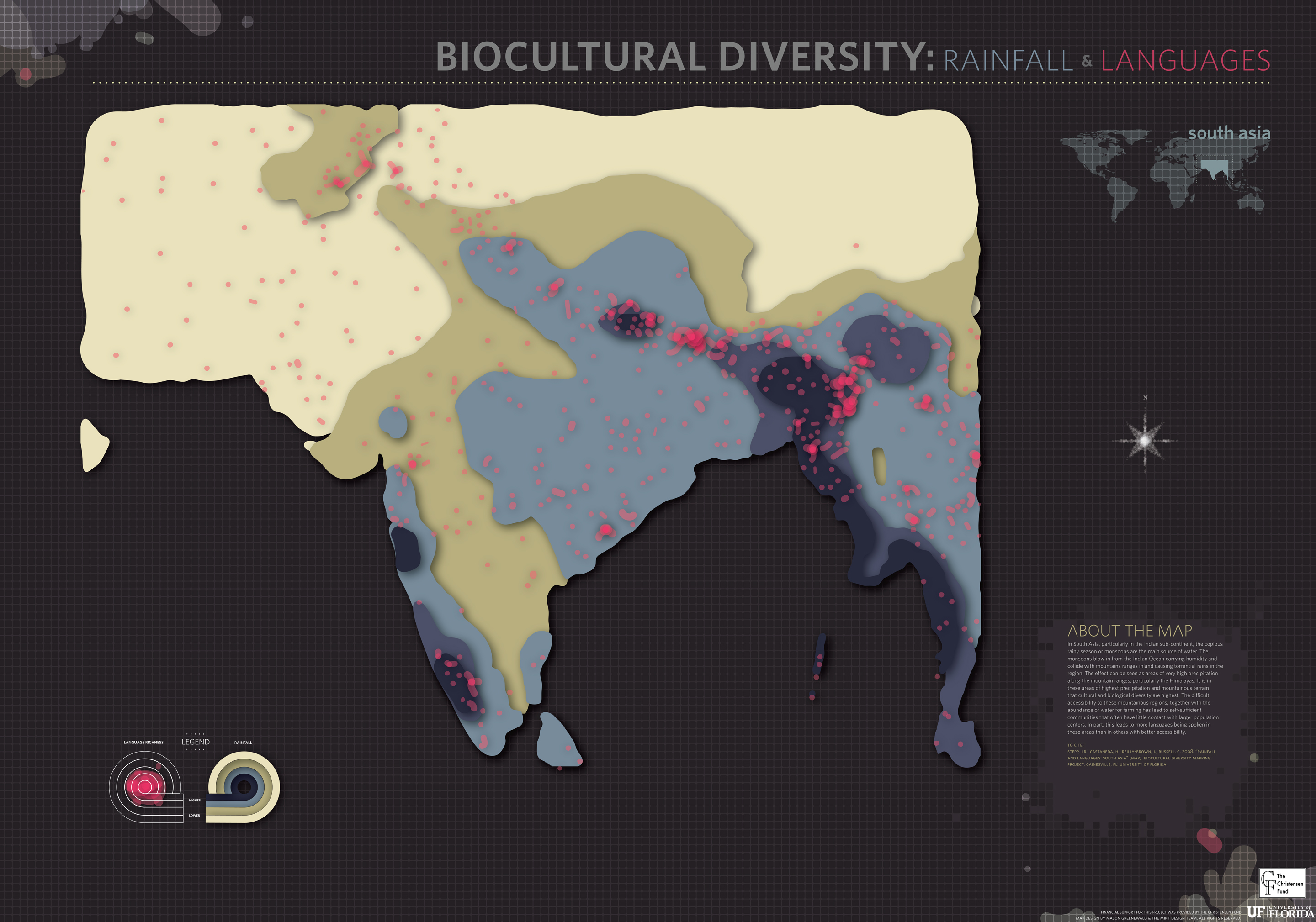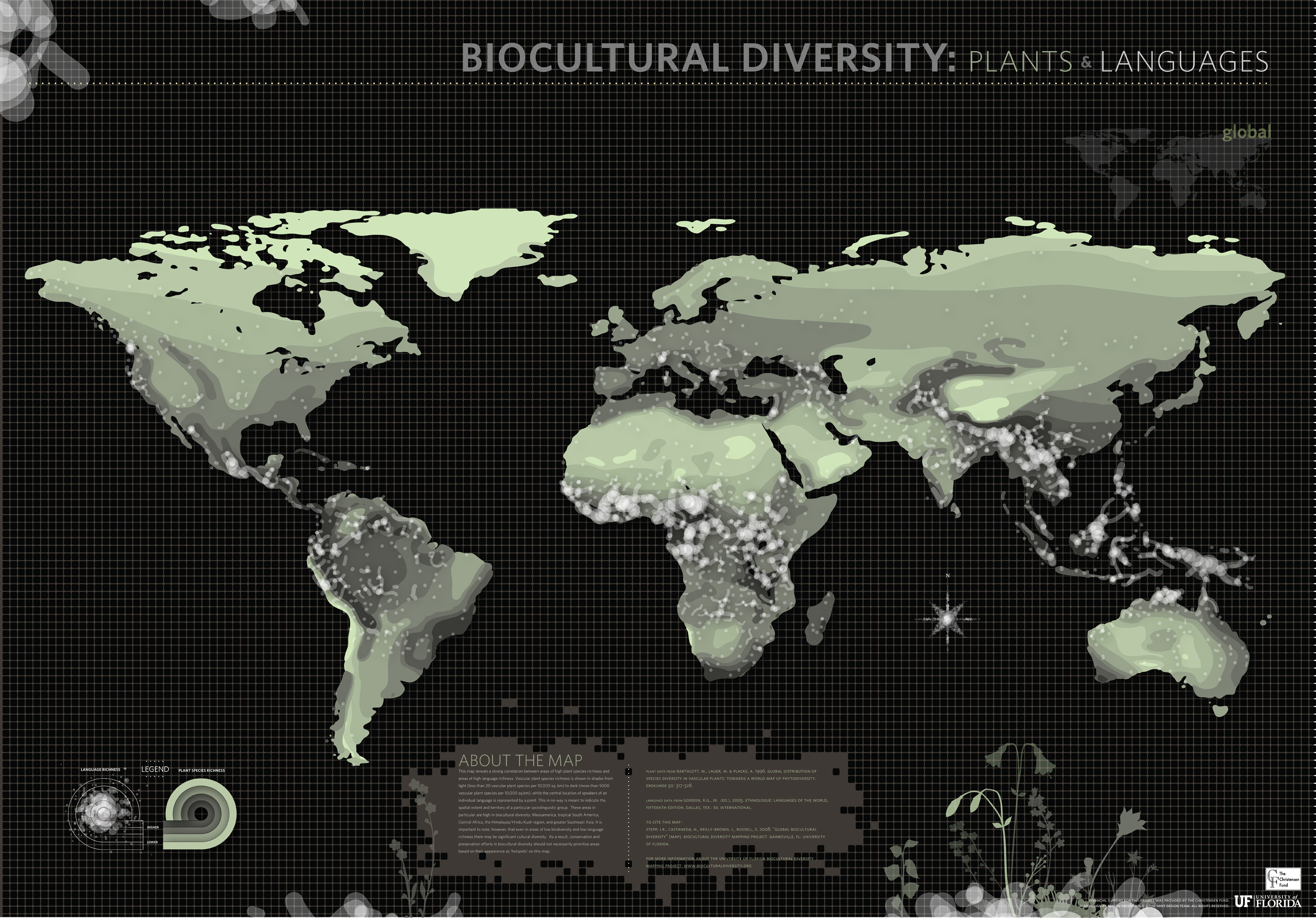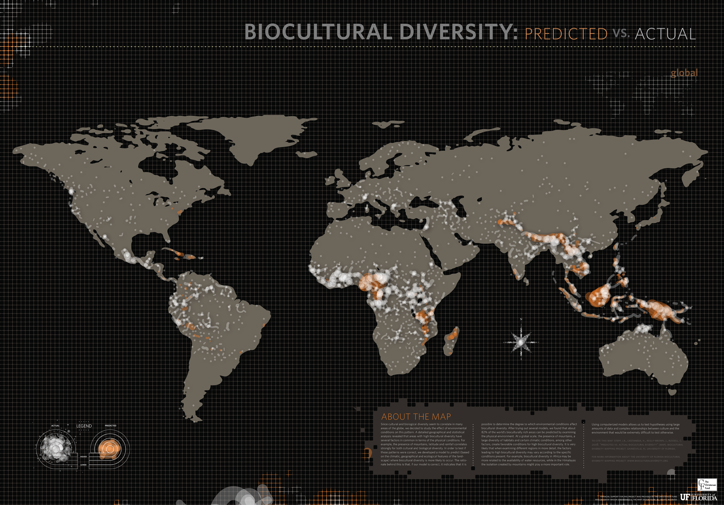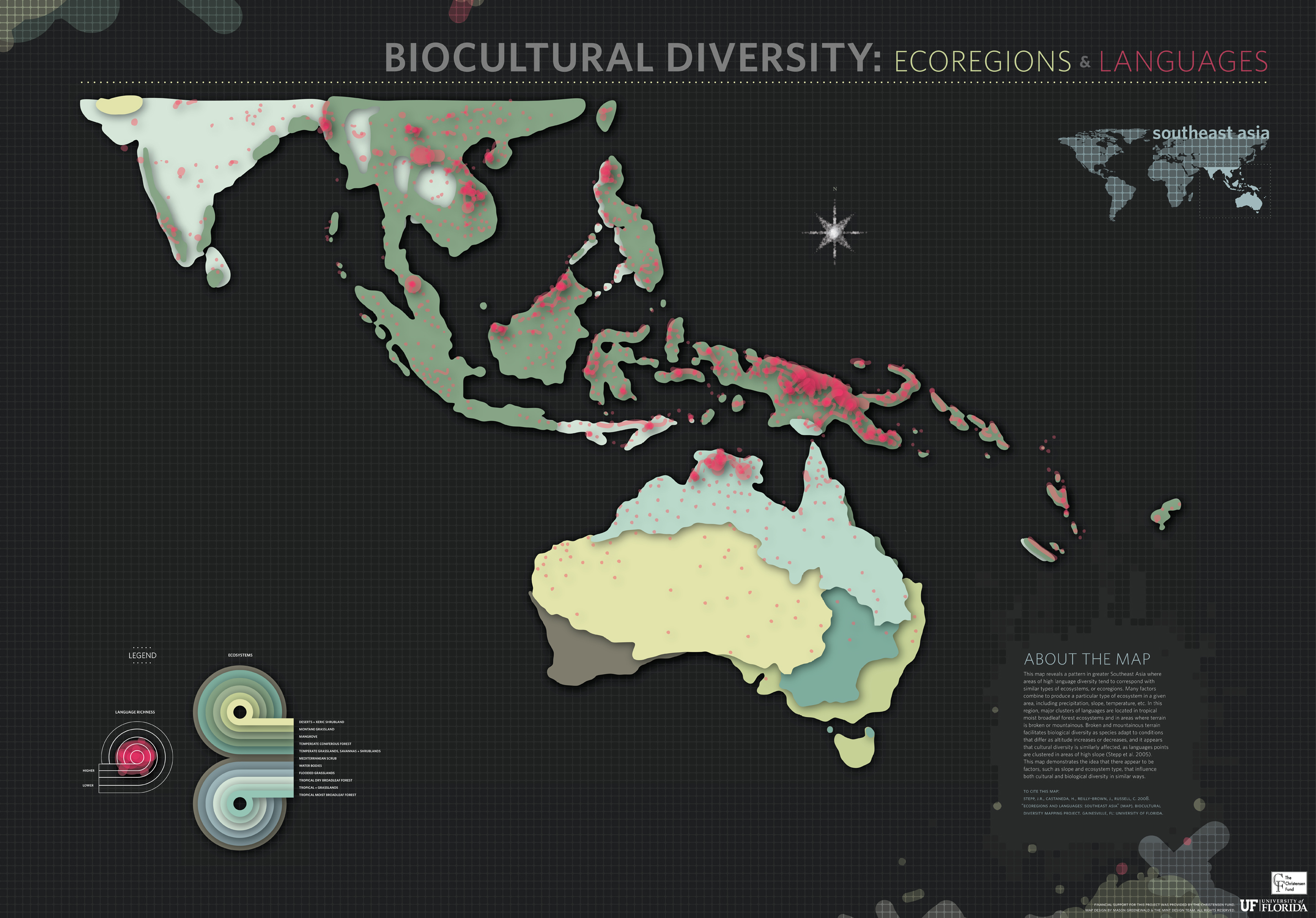 These maps represent some of the results from the University of Florida’s Biocultural Diversity Mapping Project. They feature some of the regions with high biocultural diversity, including Mesoamerica, the Amazon-Andean slope, the greater Himalayas, equatorial Africa, greater Southeast Asia/Melanesia.