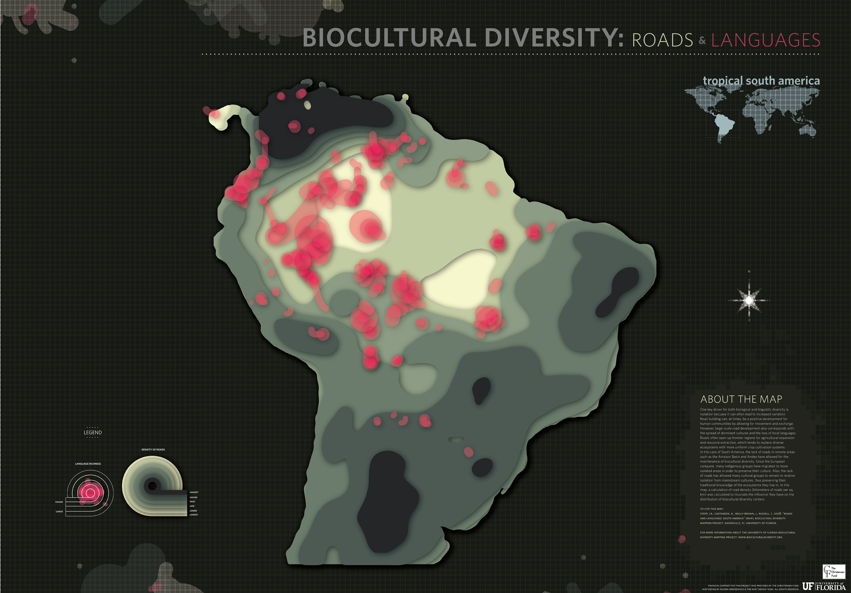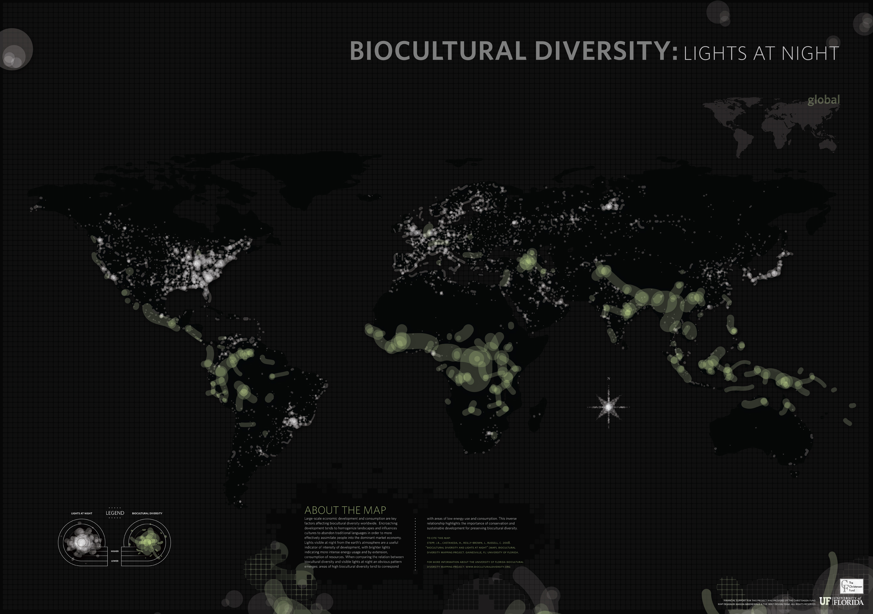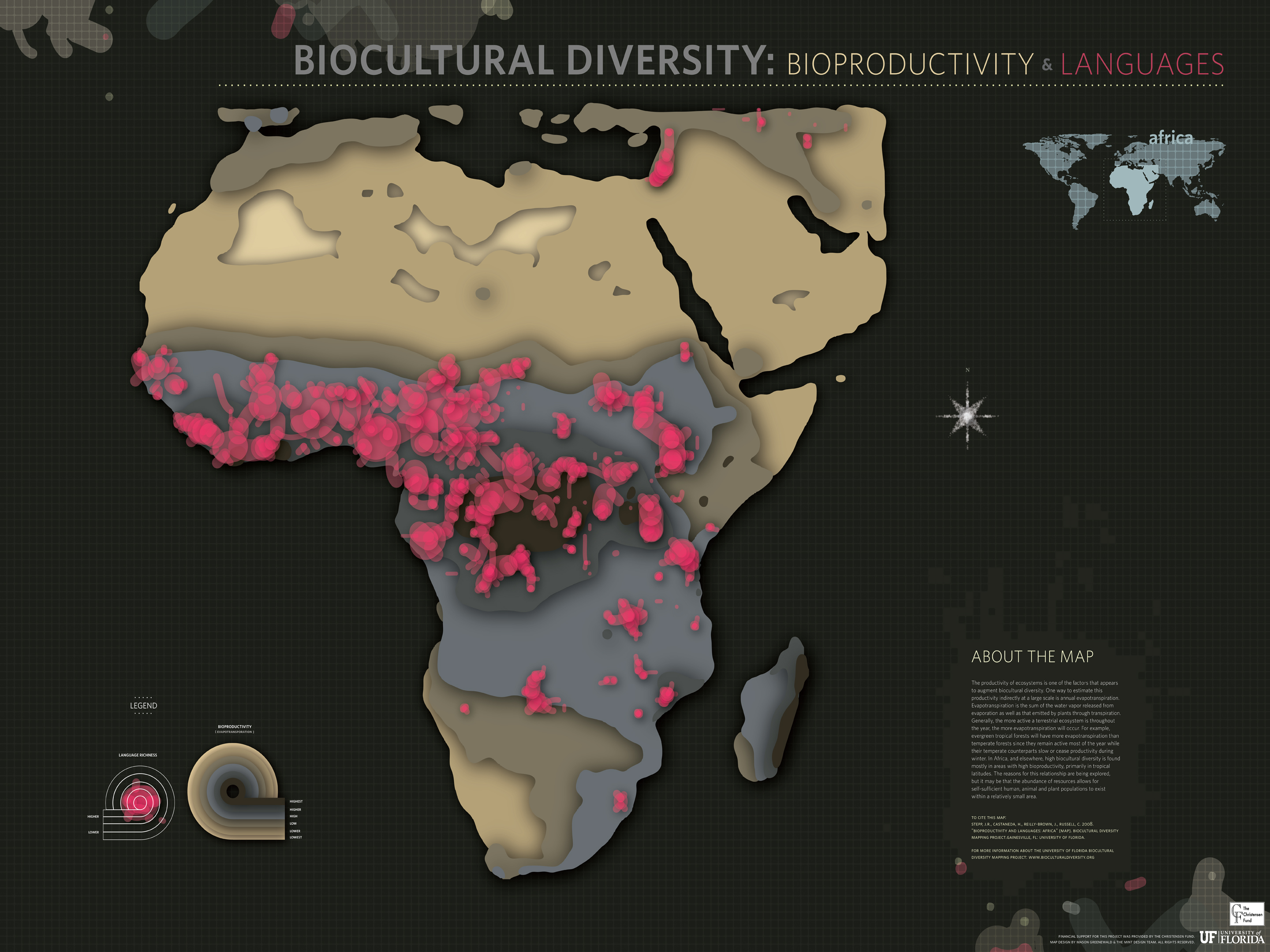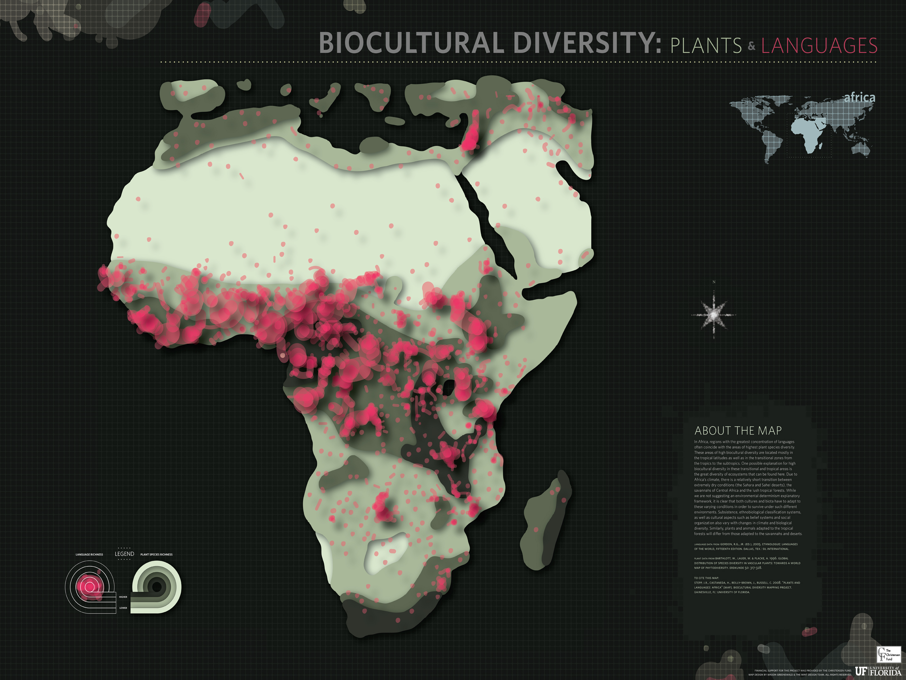 These maps represent some of the results from the University of Florida’s Biocultural Diversity Mapping Project. They feature some of the regions with high biocultural diversity, including Mesoamerica, the Amazon-Andean slope, the greater Himalayas, equatorial Africa, greater Southeast Asia/Melanesia.